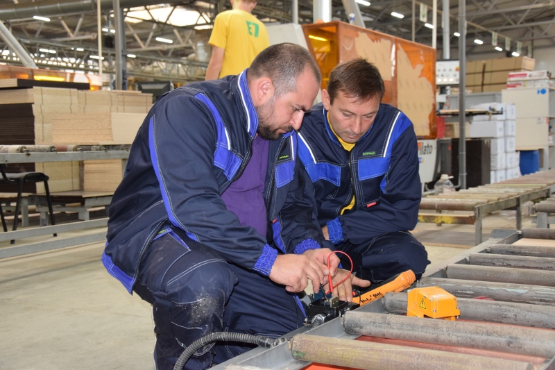 Виктор Токарев и Виталий Ибрагимов проверяют исправность кромко-облицовочного станка